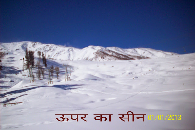 होटल से बाहर आए ओर कुछ दूर ही चले थे की घोडे वालो ने घेर लिया.पर हमने बैठने से मना कर दिया ओर आगे चल दिए.आज मौसम साफ था धुप निकल रही थी पर ठण्ड कम होने का नाम नही ले रही थी.चलते रहे एक जगह शोर्टकट भी मार दिया पर हमारे पैर घुटनो से ऊपर तक बर्फ मे फसं गए फिर कोई शार्टकट नही मारा.आगे चलकर एक गंडौला का टिकेट घर आया.तीन टिकेट ले लिए गए शायद 120 रू० का एक था.टिकेट लेने के बाद सेना के जवान सभी यात्रीयो की तलाशी ले रहे थे.वहा से गुजरते हुए हम लोहे की सीढियों तक पहुंचे. उन पर बर्फ पडी हुई थी जिस कारण फिसलन हो रही थी.उन्हे पार करते हुए हम एक केबल कार (ट्राली) मे बैठ गए ओर ऊपर की तरफ चल पडे.जैसे जैसे हम ऊपर जा रहे थे बर्फ भी उतनी ही अधिक होती जा रही थी.यहा से बहुत शानदार नजारै दिख रहे थे.ट्राली से नीचे देखा तो कुछ घर पूरी तरह से बर्फ से ढंक चुुके थे शायद उनमे कोई रहता नही होगा.बर्फ हटाने वाली गाडी ऊपर की ओर रास्ता बनाती जा रही थी.आखिरकार हम ऊपर पहुंच ही गए.
