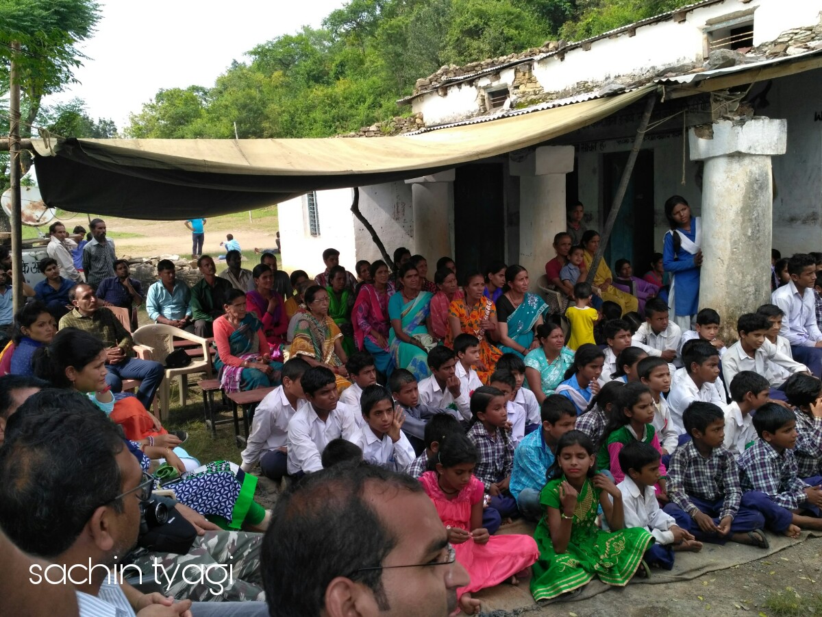 सुबह जल्दी ऊठ गया। बाहर कुछ पक्षियों ने सुरीला राग जो छेडा हुआ था। हरीश जी ने बैड टी (चाय) बना कर पिला दी। बाकी दोनो दोस्त अभी बिस्तर पर ही विराजमान थे। चाय पीने के बाद मैं थोडा घुमने चल पडा। पक्षी अभी भी सुबह सुबह मधुर गीत सुना रहे थे। कुछ लोग अपनी बकरियों व गाय को चारा दे रहे थे। कुछ बुजुर्ग लोग घर से निकल कर बाहर बैठे हुए थे। मै घुमता हुआ पंचायत भवन पहुंचा, जहां रात हमने खाना खाया था। थोडी देर बाद बीनू भी आ गया। बीनू और मैने बच्चो को दिए जाने वाले गिफ्ट व बांटे जाने वाली अन्य सामाग्री को अलग कोने में रख दिया। जिससे कोई समान यहां रह ना जाए। क्योकी हमे तकरीबन 2 किलोमीटर नीचे स्कूल में पहुँचना था। समान अलग रख कर मैं वापिस कमरे पर पहुंचा। नहाने व दैनिक कार्यो से निवर्त होकर हम तीनो तैयार थे स्कूल जाने को। हरीश जी ने एक बार और चाय व साथ में खाने के लिए बिस्किट दिए। समय लगभग 7:30 हो रहा था। हम सब पंचायत भवन पहुंचे और कुछ समान लेकर नीचे स्कूल की तरफ चल पडे। स्कूल तक बहुत उतराई थी मतलब आते वक्त बहुत चढ़ाई मिलेगी। हम बिना थके आगे बढ़ चले। हरीश जी पांचवी तक के स्कूल में रूक गए और हमे कहा की मै कुछ काम करके आता हूं आप लोग नीचे बडे स्कूल पर पहुंचे जहां पर आज दोनो स्कूलो का कार्यक्रम होना है।