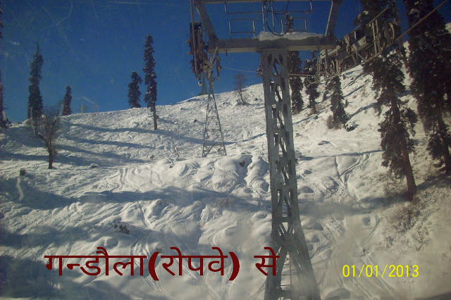 होटल से बाहर आए ओर कुछ दूर ही चले थे की घोडे वालो ने घेर लिया.पर हमने बैठने से मना कर दिया ओर आगे चल दिए.आज मौसम साफ था धुप निकल रही थी पर ठण्ड कम होने का नाम नही ले रही थी.चलते रहे एक जगह शोर्टकट भी मार दिया पर हमारे पैर घुटनो से ऊपर तक बर्फ मे फसं गए फिर कोई शार्टकट नही मारा.आगे चलकर एक गंडौला का टिकेट घर आया.तीन टिकेट ले लिए गए शायद 120 रू० का एक था.टिकेट लेने के बाद सेना के जवान सभी यात्रीयो की तलाशी ले रहे थे.वहा से गुजरते हुए हम लोहे की सीढियों तक पहुंचे. उन पर बर्फ पडी हुई थी जिस कारण फिसलन हो रही थी.उन्हे पार करते हुए हम एक केबल कार (ट्राली) मे बैठ गए ओर ऊपर की तरफ चल पडे.जैसे जैसे हम ऊपर जा रहे थे बर्फ भी उतनी ही अधिक होती जा रही थी.यहा से बहुत शानदार नजारै दिख रहे थे.ट्राली से नीचे देखा तो कुछ घर पूरी तरह से बर्फ से ढंक चुुके थे शायद उनमे कोई रहता नही होगा.बर्फ हटाने वाली गाडी ऊपर की ओर रास्ता बनाती जा रही थी.आखिरकार हम ऊपर पहुंच ही गए.